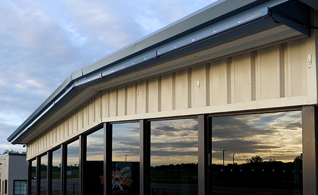 Our steel storefront LED lighting system offers two different cover bends that allow the lights to be mounted to a variety of commercial structures, while our acrylic covers create a flush look. In addition to roofline mounting, this commercial outdoor lighting system can double as patio lighting when mounted downward!